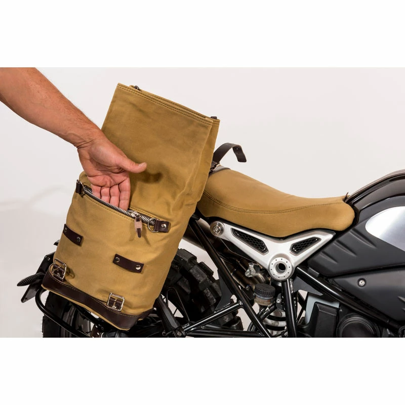 side bag with frame Purse handmade in Italy in rugged cotton waterproof top quality. And accurate finished in 3 mm leather, simple and pure as the materials with which it was built. It quickly attaches to our frame portaborsa cod 1609 with the quick release system applied on the back of the bag which is fitted with a lock for locking. Can stay inside a laptop 15 , it is equipped with a large zippered pocket for phone and documents. Dimensions: Height 32 cm (extendable to a height of 45 cm) width 24 cm depth 13 cm Color: Beige waterproof canvas with brown leather trim Frame in steel treated with black matte finish episodic powders. Drawn on NINET integrates seamlessly with the rest of the bike. Ready to host our quick coupling system, beautiful and minimal even when the bag is not mounted. It comes complete with screws and is easy to mount on the bike in the original configuration with or without frame passenger or with our accessories such as: Plate rear light support cod 1604 Passenger handle code 1605 NB: It can be used comfortably with the passenger on board