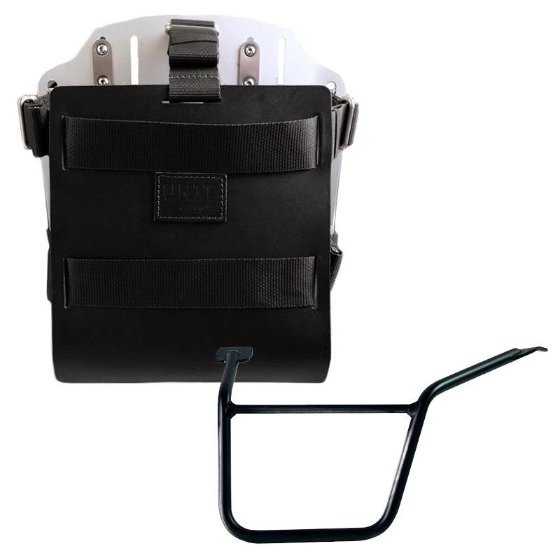 Carrying system in aluminum complete with adjustable leather front. It quickly attaches to our bag holder frames with the quick release system cod.U000 already included and mounted on the back of the plate , which is equipped with a lock for locking on the frame itself. The plate creates a flat mounting surface on the side of the bike, this will allow the transport of unattached bags or other objects, such as sleeping bags, jackets etc. The front flap, with attention to the smallest details with 3 mm leather finishes, can be adjusted using the supplied sliders and can be removed very quickly from the plate.