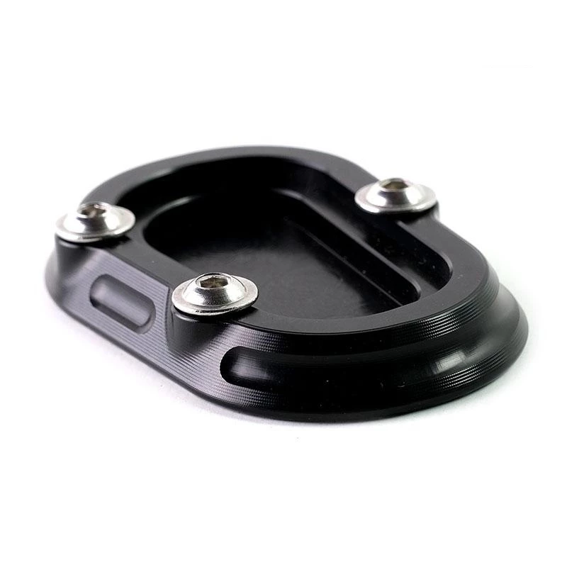 The supporting surface of the original side stand is quite poor. On a soft background or hot asphalt, this Ergal plate made from solid allows a secure support.