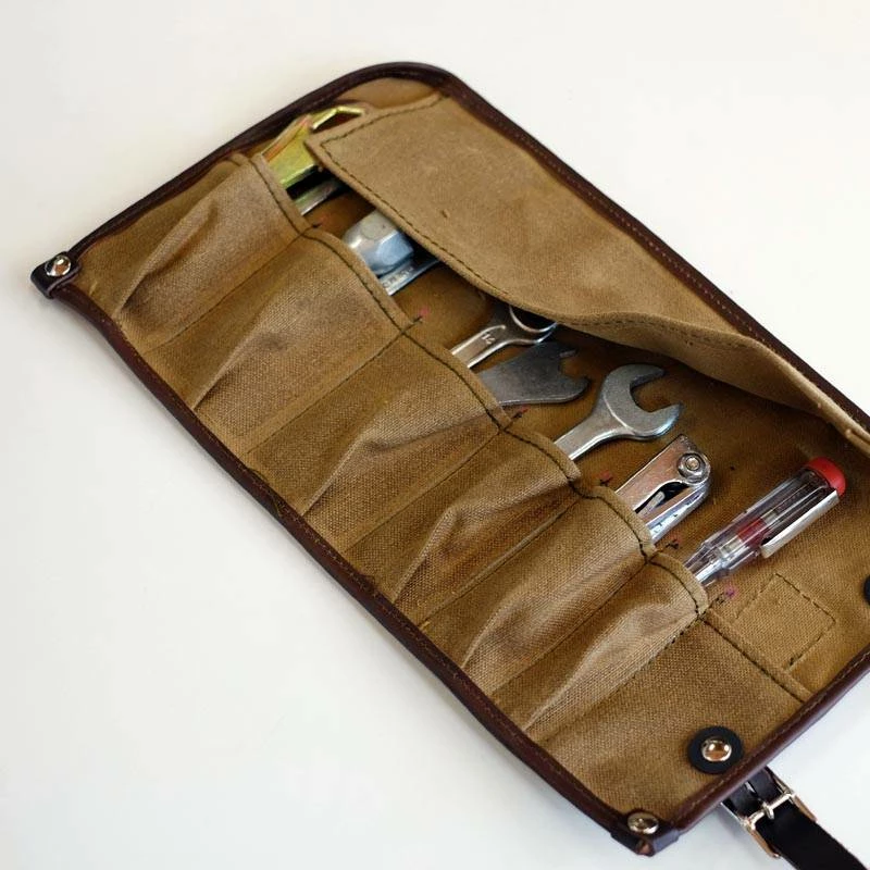 Tool bag holder made and hand-sewn in cotton and leather.