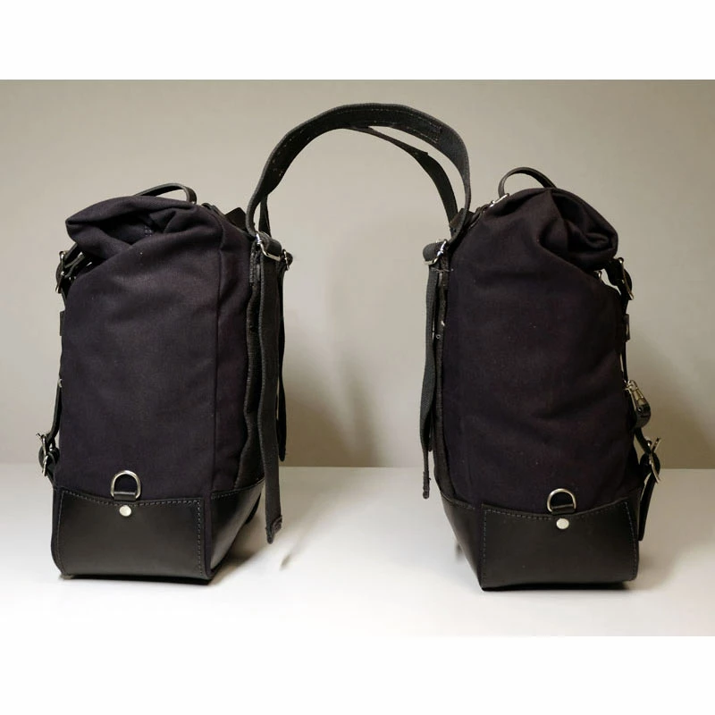 Simple and pure as the materials with which they were built. Bags couple handmade in Italy in rugged cotton waterproof top quality. Meticulous in detail finished in 3mm leather. Universal and adaptable to all bikes, simply by moving the regulation of central strips you change the height from the ground. The back of the bag is provided with hooks in fabric for fixing on the bike. On the front of a large zipper pocket for phone and documents. X 1 bag measures: height 38 cm (extendable to a height of 45 cm) width 35 cm depth 15 cm Once off the bike, using posssono center sections to be sling or shoulder color: black waterproof canvas with black leather trim